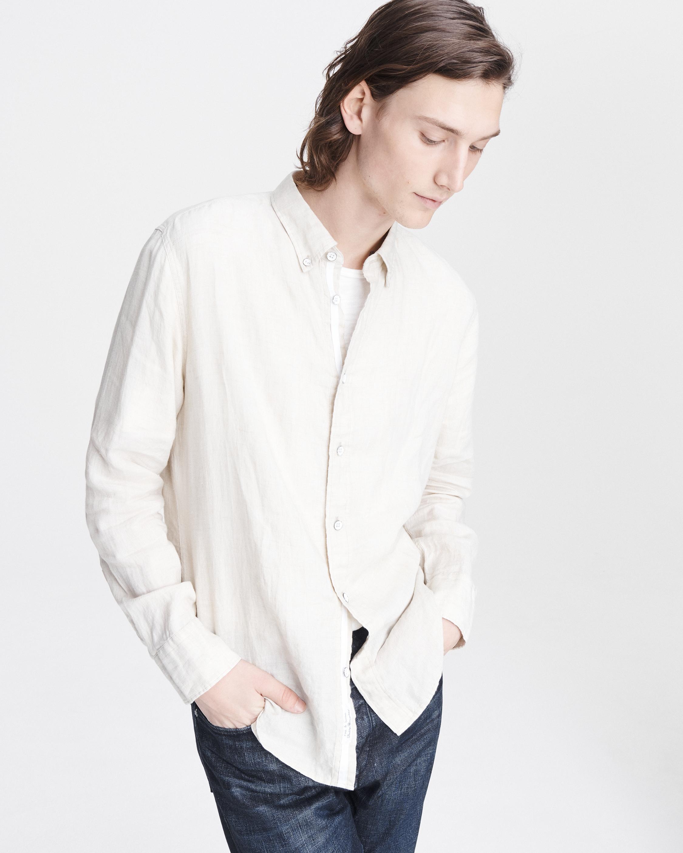A classic shirt cut for a slim fit from a soft, breathable, yarn-dyed linen. Complete with signature rag & bone details such as a full button-down collar, metal Apholos buttons throughout, center back inverted box pleat, and a grosgrain locker loop at the neck for easy hanging.