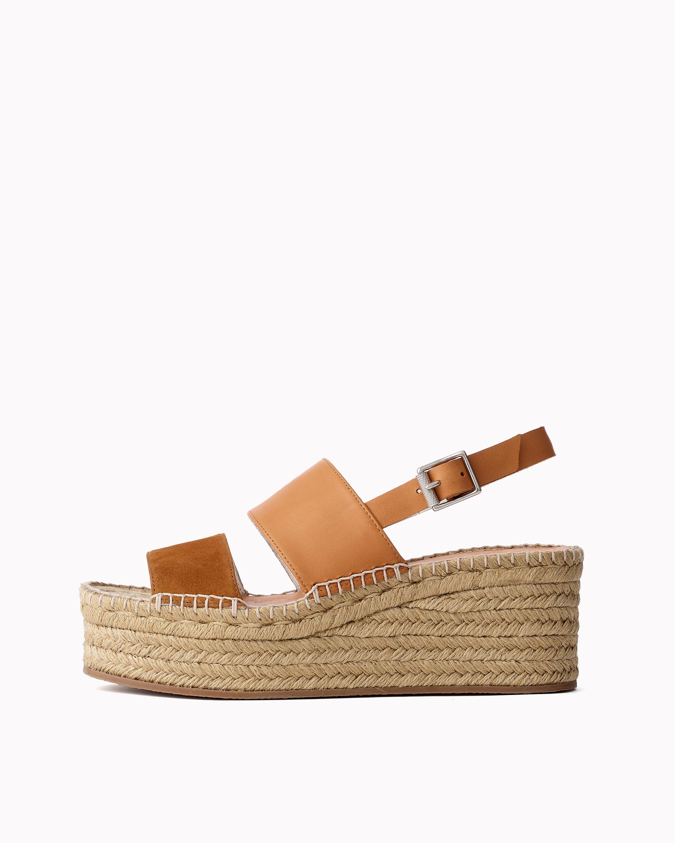Our Edie wedge takes the classic espadrille to new heights in a 100% cow leather and suede combo with a 3-inch jute platform.