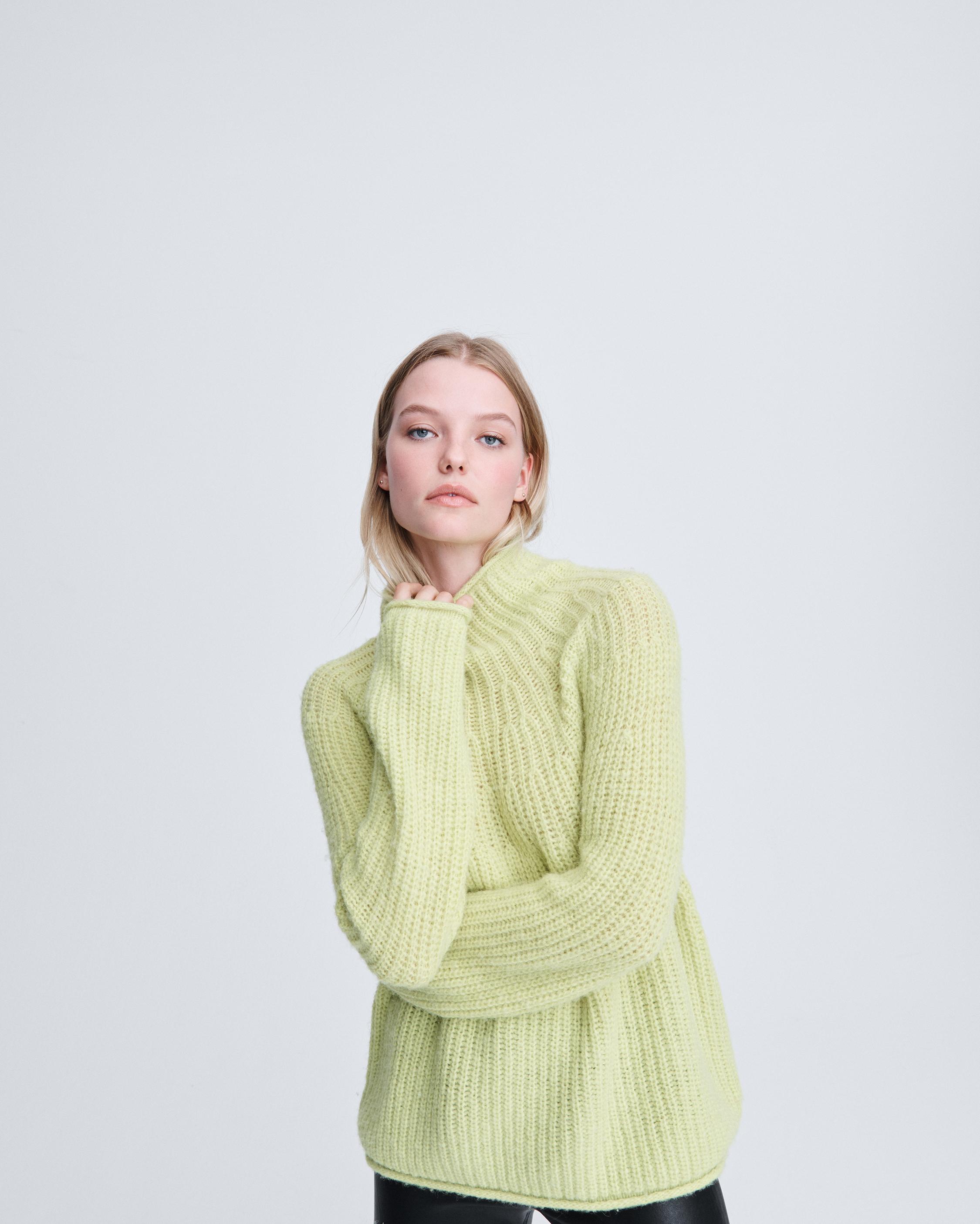 Cozy and ahead of the curve. An alpaca loose-weave turtleneck sweater with jersey-roll details and an engineered rib structure for curved sleeves and a relaxed fit.