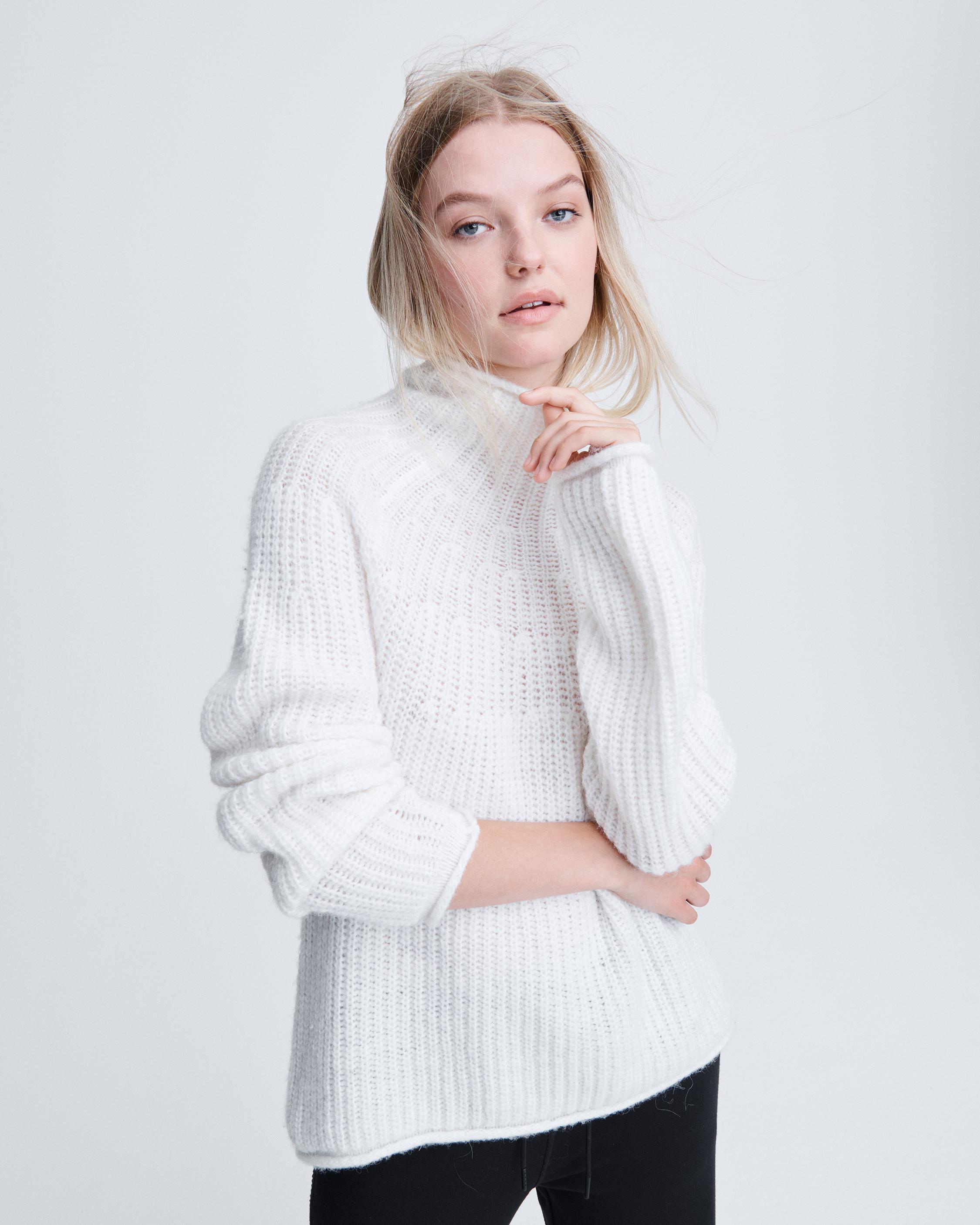 Cozy and ahead of the curve. An alpaca loose-weave turtleneck sweater with jersey-roll details and an engineered rib structure for curved sleeves and a relaxed fit.