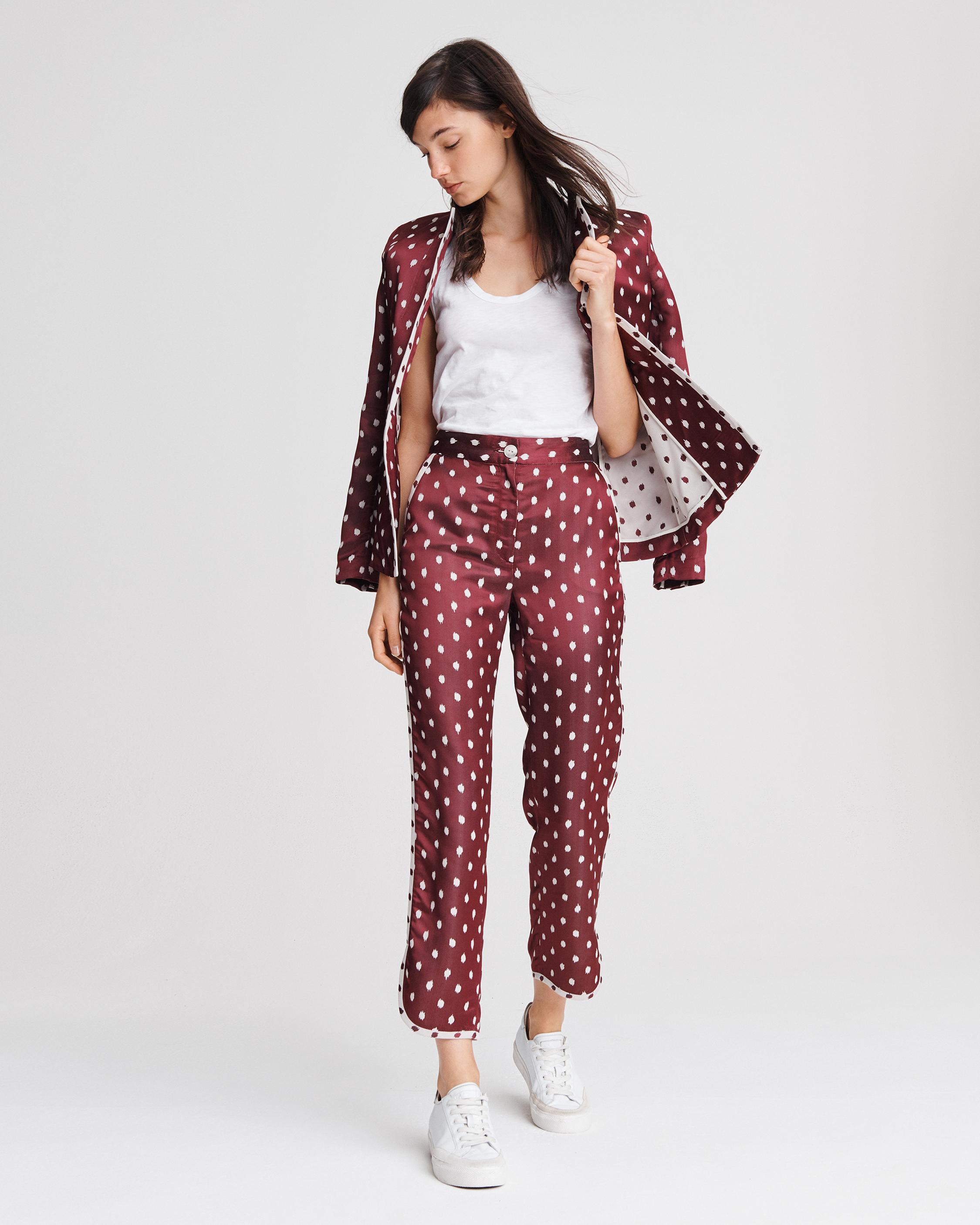 An athletic-inspired cropped pant that belongs outside the gym. Cut from an Italian jacquard fabric with a playful polka dot print and contrast hem.