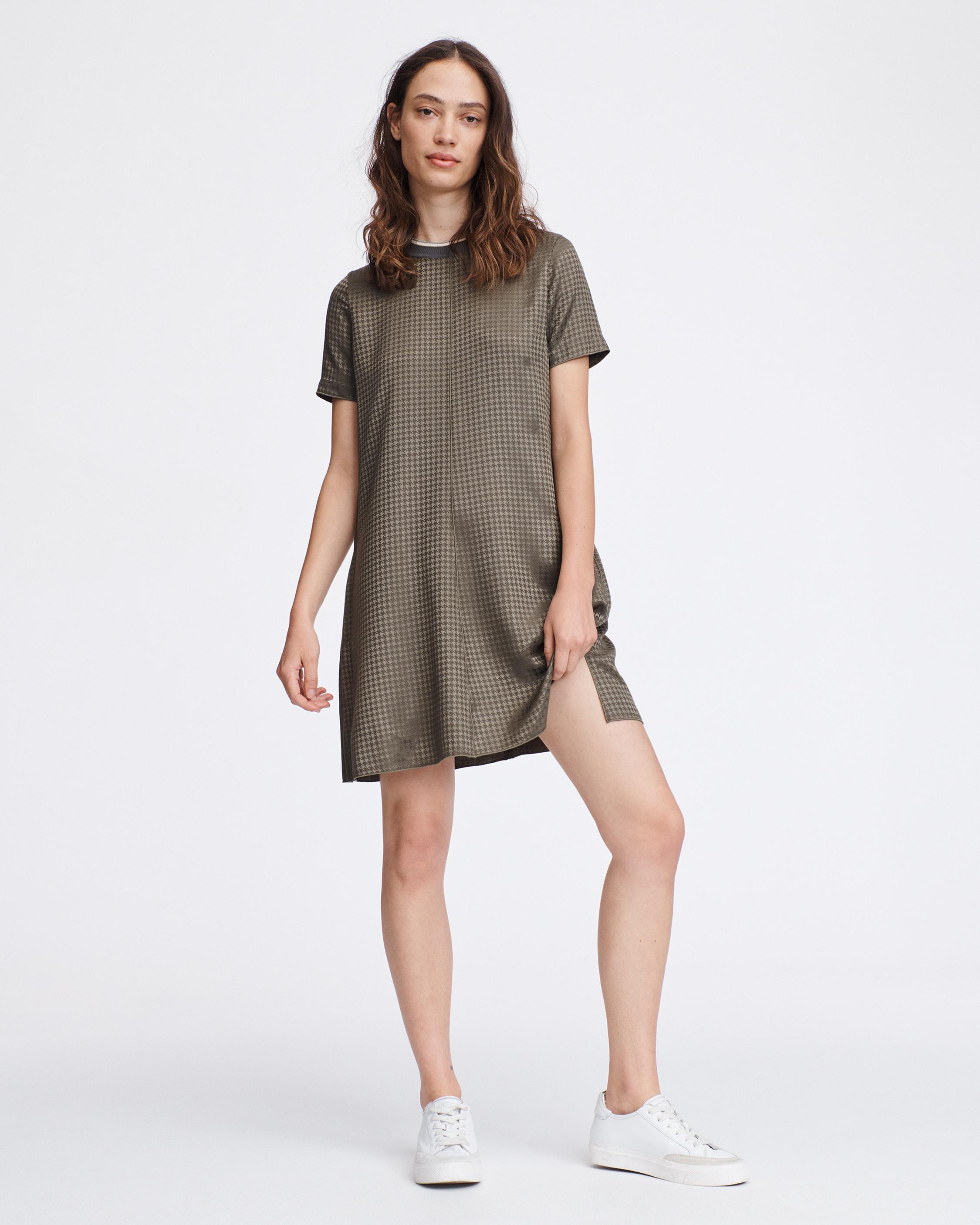 An easy-to-wear-anywhere t-shirt dress in an olive houndstooth print with a knit collar. Cut to the knee with a loose fit.