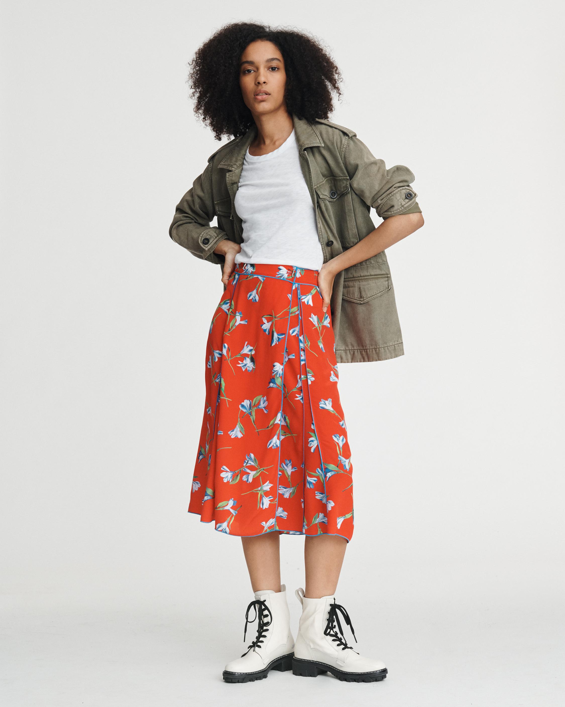 This new essential skirt has a classic wrap fit that is universally flattering. Cut from a red floral crepe de chine.