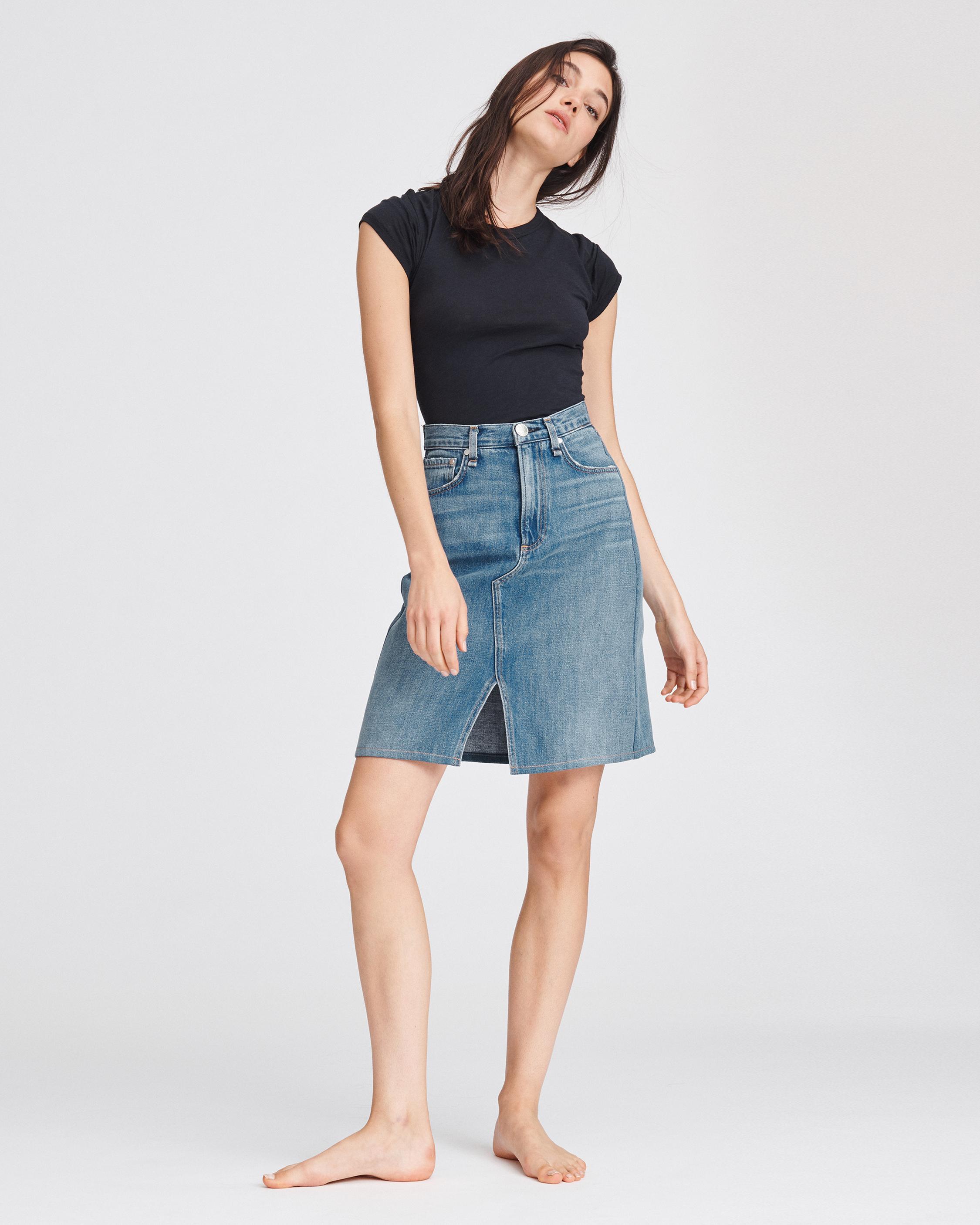 With a super high-rise and knee length style, this rigid Japanese denim skirt is a new essential.